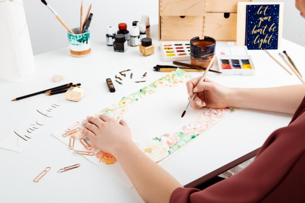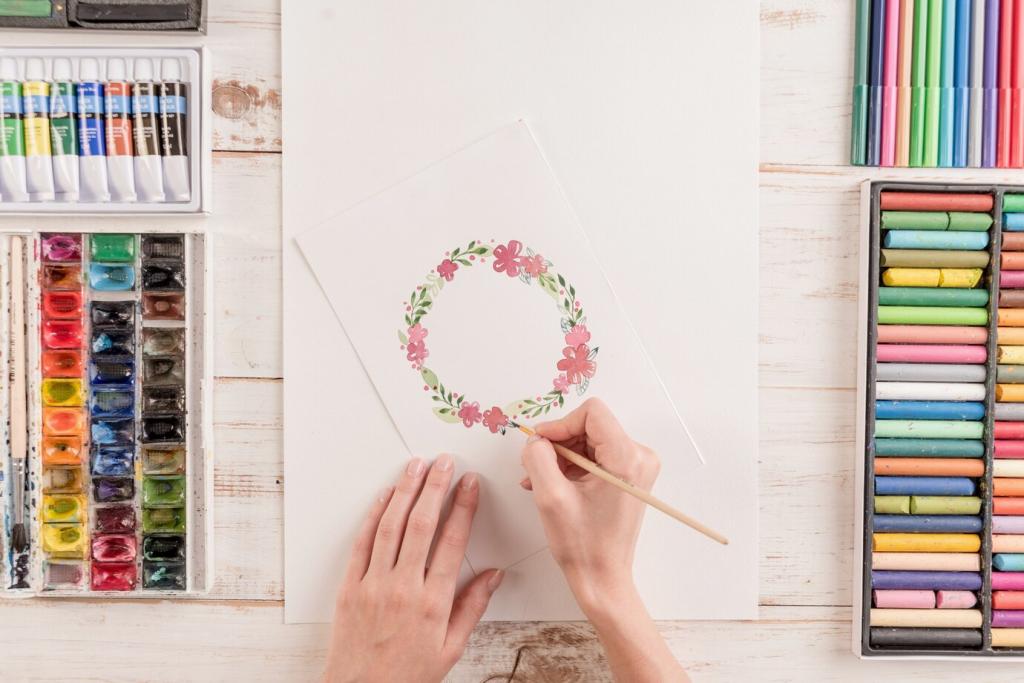 Streue grobes oder feines Salz auf feuchte Farbe und beobachte die kristalline Sogwirkung. Warte geduldig, blase nicht. Bürste trocken ab und nutze die Formen als Startpunkt für funkelnde Details.